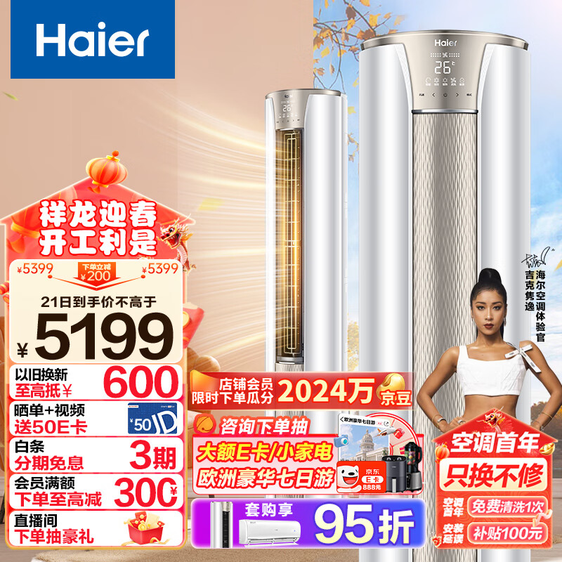 海尔(Haier)3匹 静悦 新能效变频客厅家用空调立式柜机 自清洁 京东小家智能 KFR-72LW/06KCA83U1 以旧换新价格:5199.00元!