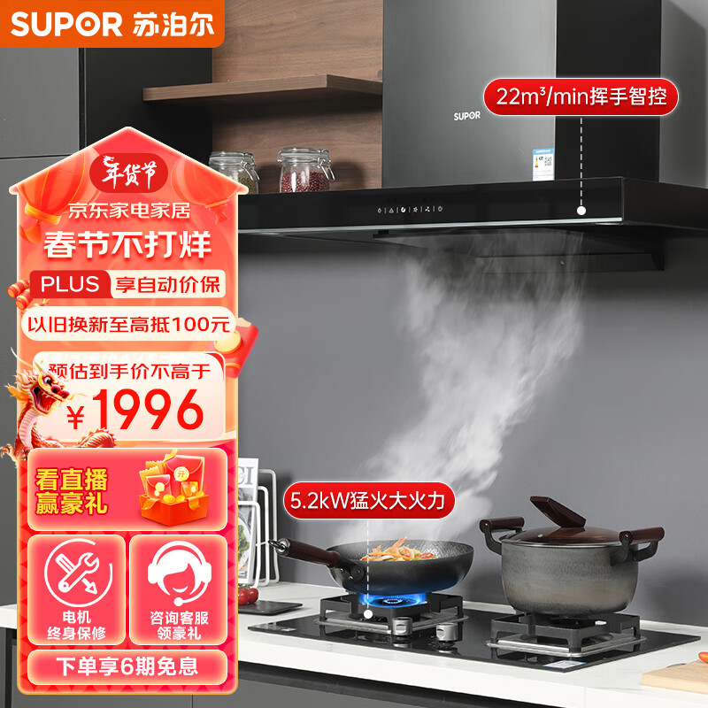 苏泊尔(SUPOR) 抽油烟机 烟灶套装22立方家用欧式吸油烟机燃气灶具套装挥手智控 自清洁 DT32+DB2Z7S液价格:2096.00元!