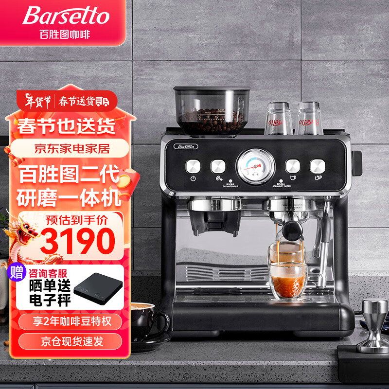 Barsetto二代咖啡机 百胜图意式半自动家用办公室研磨一体机 现磨咖啡豆手动奶泡机 双加热双泵BAE02石墨黑价格:3090.00元!