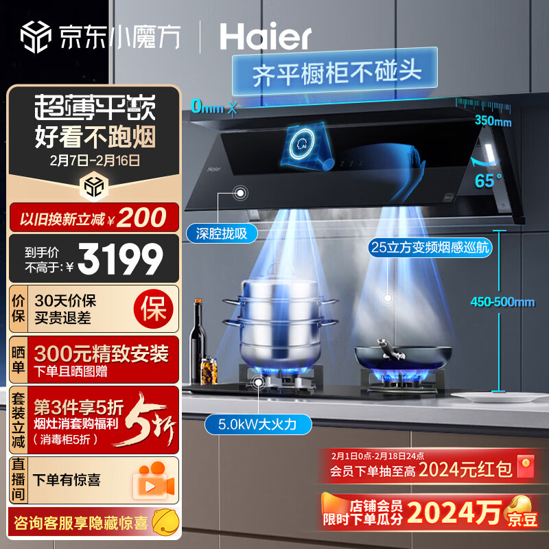 海尔(Haier)抽油烟机 超薄近吸烟灶套装 25m3/min变频有效风顶侧双吸外观 厨房吸油烟机燃气灶具C21U1+Q2BE2天价格:3199.00元!