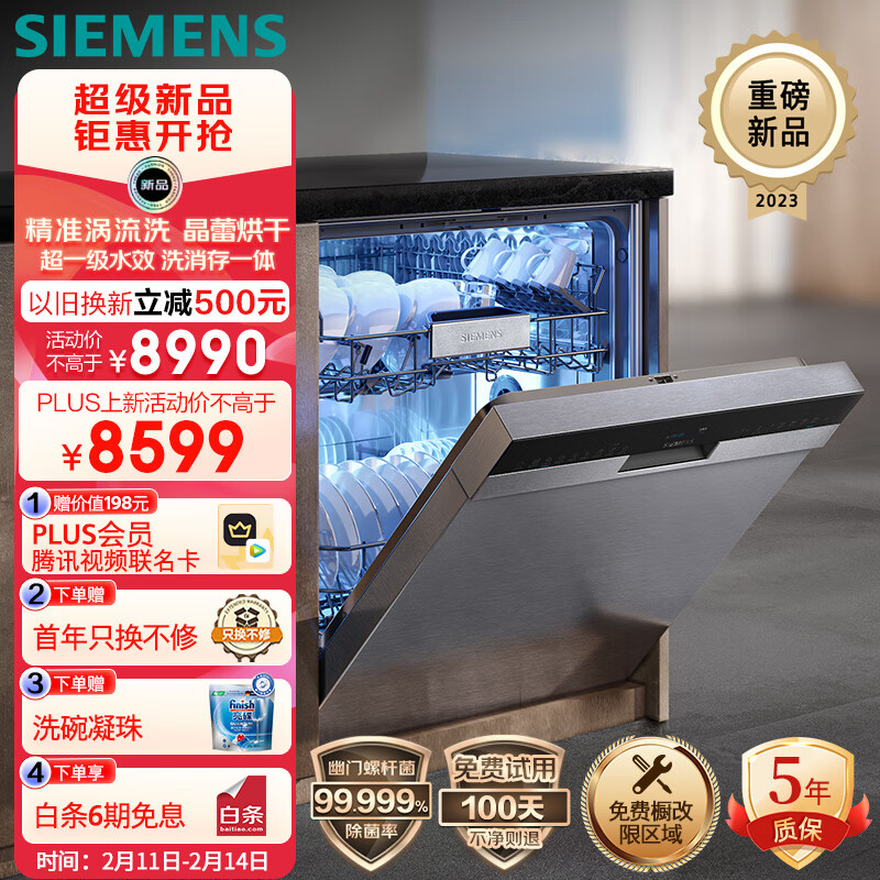 西门子14套洗碗机嵌入式 精准涡流洗 晶蕾除菌烘干 一级水效 变频电机 96h存储 分区强洗 SJ45ZS00KC价格:8599.00元!