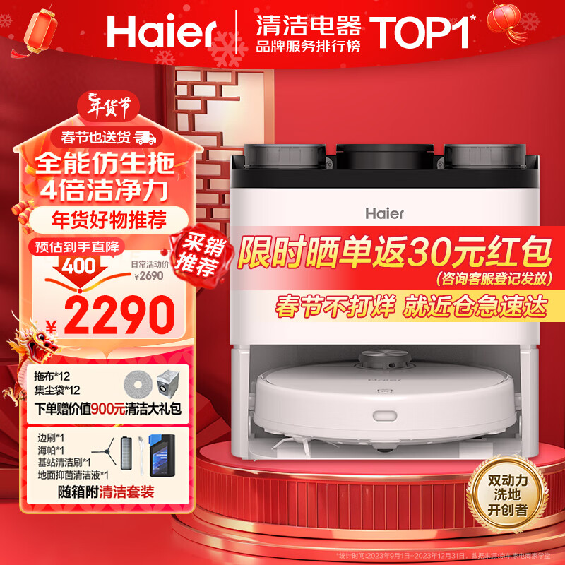 海尔Haier扫地机器人扫拖一体自清洁免洗拖地机器人智能全自动家用擦地机小金刚JH68U1价格:2280.00元!
