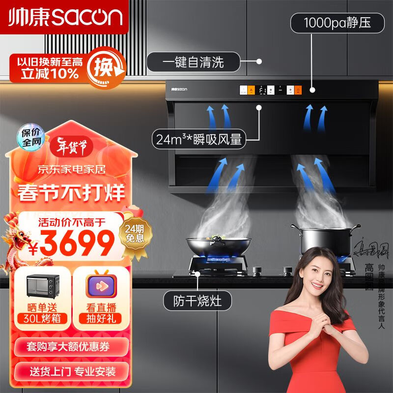 帅康(Sacon)油烟机 顶侧双吸变频静音抽油烟机 24m3瞬吸大风量 挥手智控 自清洗油烟灶套餐Y8275+E8D01F天然气价格:3699.00元!