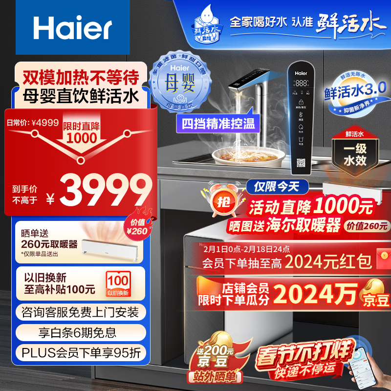 海尔(Haier)鲜活水净热一体鲜腾加热直饮一体机家用净水即热零冷水厨下式RO反渗透过滤器直饮机HKC1560价格:3999.00元!