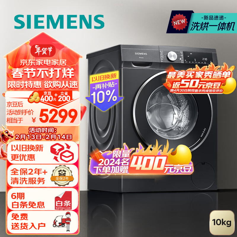 西门子(SIEMENS)iQ300曜石黑系列 10公斤滚筒全自动洗衣机烘干一体机 智能投放 多维立体烘干 除菌除螨 A20W价格:5899.00元!