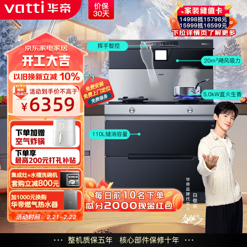华帝(VATTI)集成灶消毒柜 集成一体灶 挥手智控 20m3吸力+5.0kW火力 一键智清洗 烟机灶具套装 i3028G天然气价格:6359.00元!