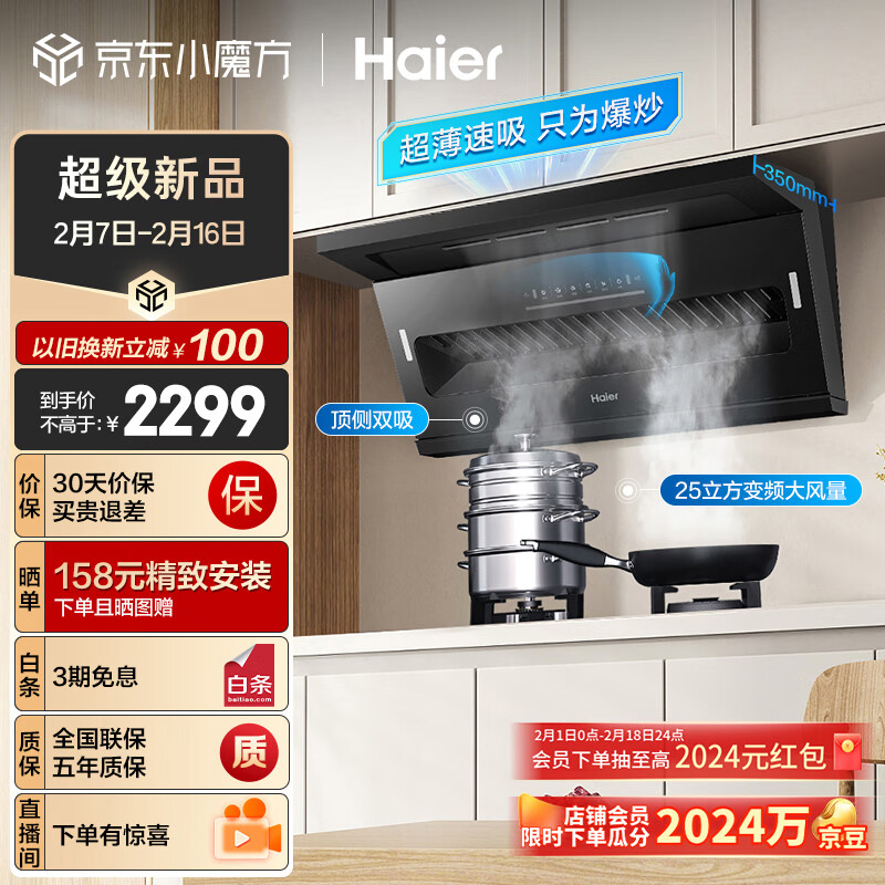海尔(Haier)抽油烟机 顶侧双吸 7字型家用排烟机 25m3/min大吸力 齐平橱柜 挥手智控 自动清洗排吸烟机C61价格:2299.00元!