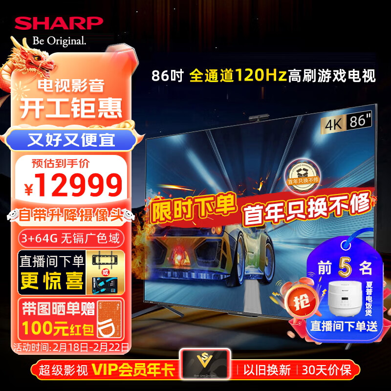SHARP夏普4T-C86V7EA 86吋 全通道120Hz高刷 110%无镉广色域 3+64G 5扬声器20W重低音 HDMI2.1 游戏电视价格:12999.00元!