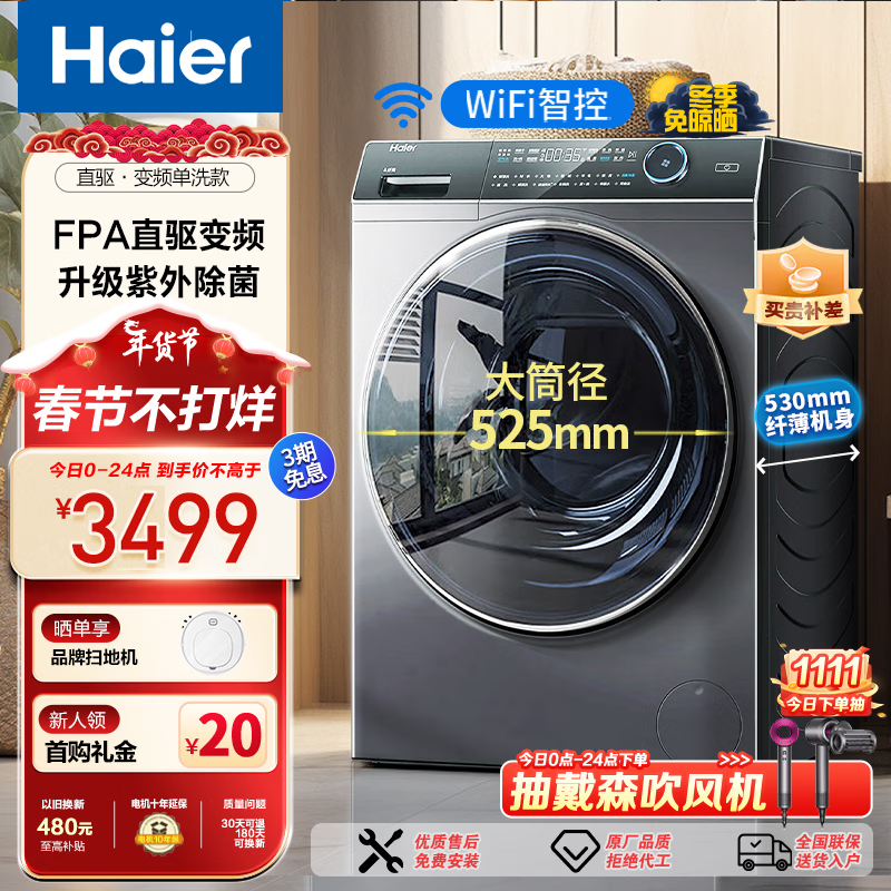 海尔(Haier)洗衣机10公斤超薄全自动滚筒直驱变频洗衣机智能投放紫外除菌WIFI智控525mm大筒径以旧换新价格:3499.00元!
