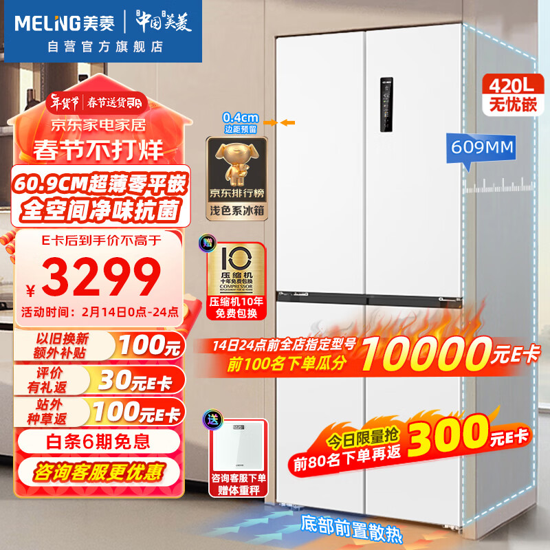 美菱(MeiLing)【无忧嵌】420升十字对开四门白色超薄零嵌入式一级双变频底部散热家用电冰箱BCD-420WP9CZX雪域白价格:3599.00元!