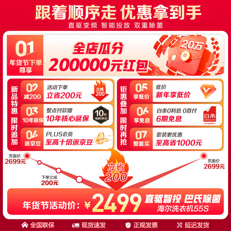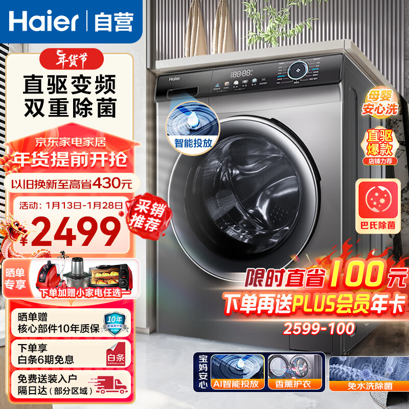 海尔(Haier)洗衣机全自动滚筒家用10公斤大容量磁悬浮直驱香薰洗智能投放巴氏除菌双喷淋洗脱一体洗衣机55S价格:2549.00元!