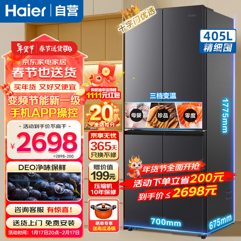 海尔(Haier)冰箱 405升四开门十字对开门多门大容量双变频一级能效风冷无霜家用智能电冰箱价格:2698.00元!