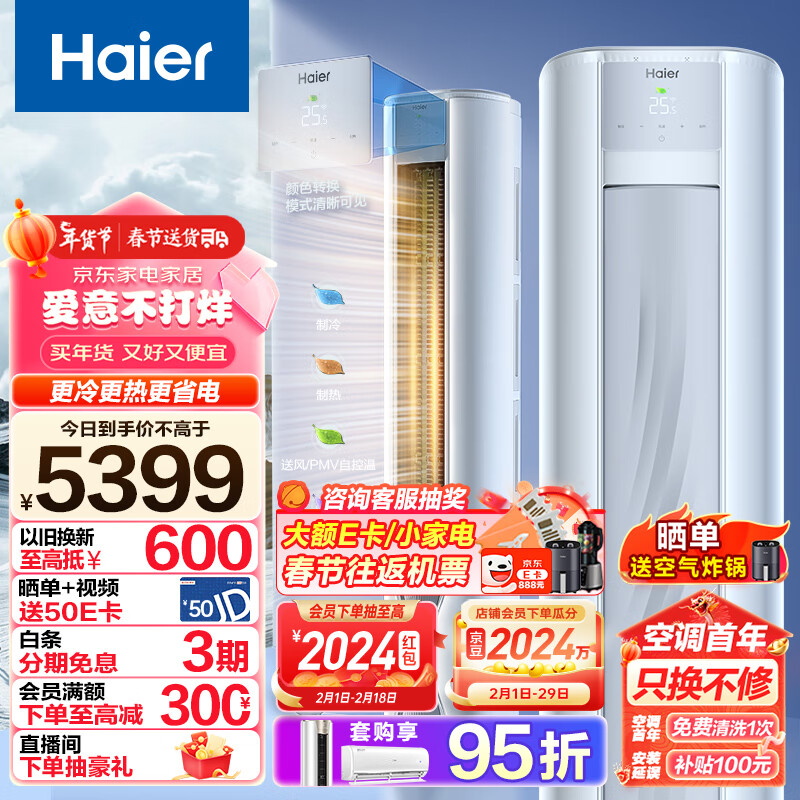 海尔(Haier)2匹 劲爽·荣耀 新一级能效 变频 快速冷暖 自清洁 家用客厅空调立式柜机 KFR-50LW/A1FAA81U1价格:5399.00元!