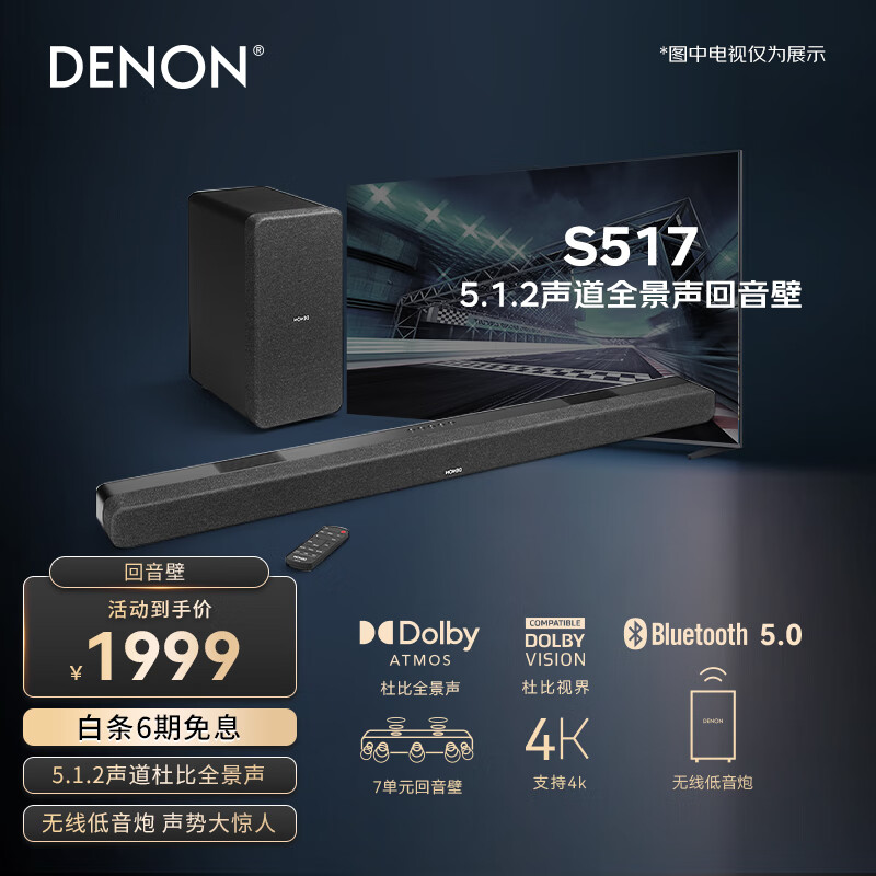 天龙(DENON)DHT-S517 杜比全景声5.1.2家庭影院回音壁/soundbar蓝牙音响 客厅电视音响 无线低音炮 黑色价格:1999.00元!