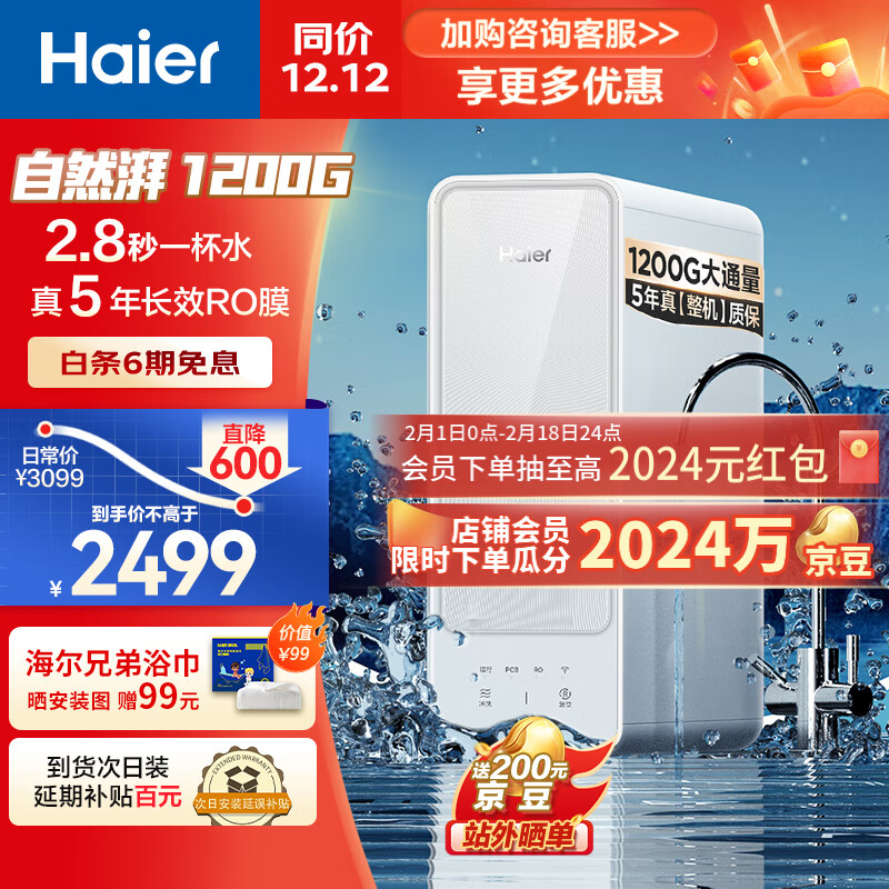 海尔(Haier)净水器家用净水机1200G大通量5年长效RO反渗透膜滤芯自清洗双出水厨下式过滤器 HRO12H99PRO-SU1价格:2499.00元!