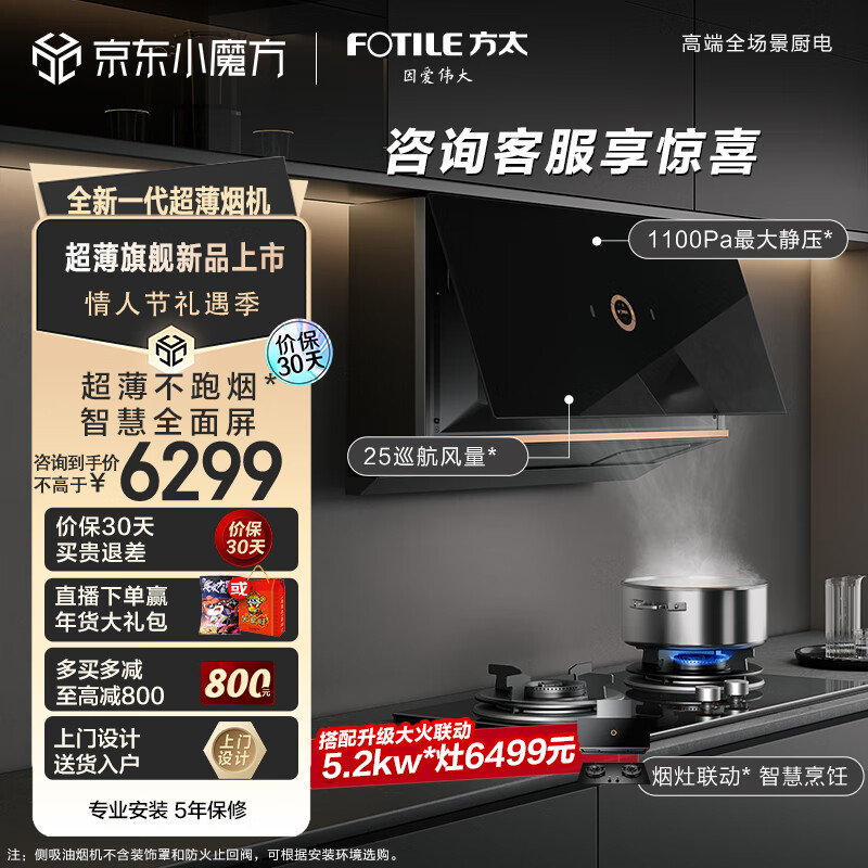 方太(FOTILE)抽吸油烟机灶具套装 侧吸式变频套装 25大风量 超薄近吸 烟灶联动 燃气猛火双灶 01-P1A.i+THF1A价格:6299.00元!