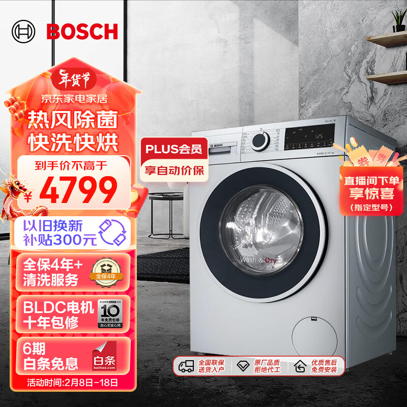 博世(BOSCH)【除菌快烘】10公斤全自动家用变频大容量滚筒洗衣机 洗烘一体机智能除菌 快洗快烘WNA154X80W价格:4799.00元!