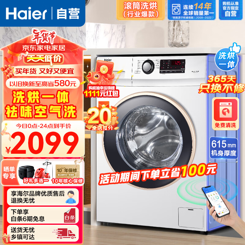 海尔(Haier)洗衣机全自动滚筒家用洗烘一体机10公斤超薄大容量除菌除螨智控WIFI空气洗海尔白价格:2199.00元!