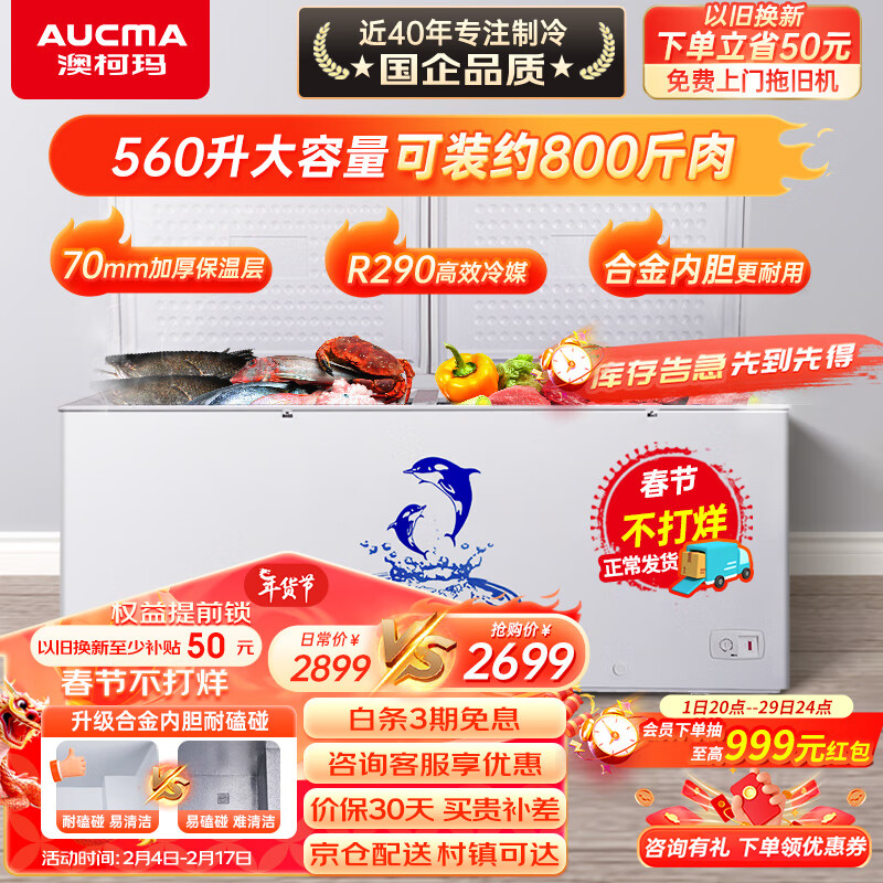 澳柯玛(AUCMA)560升家用商用大容量冰柜 卧式囤货大冰箱 冷藏冷冻转换单温顶开门冷柜 BC/BD-560TC 以旧换新价格:2799.00元!