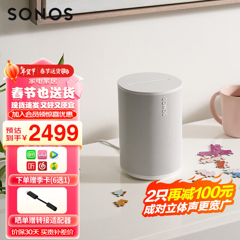 SonOS Era100 WIFI无线蓝牙 环绕可组合 家庭影院 迷你音响 One升级版 家用桌面客厅卧室书架 白色价格:2499.00元!