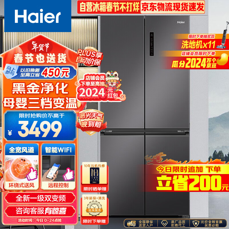 海尔(Haier)500升十字对开双开四开门电冰箱家用一级能效变频节能无霜超大容量超薄嵌入式BCD-500WLHTD78SMU1价格:3499.00元!