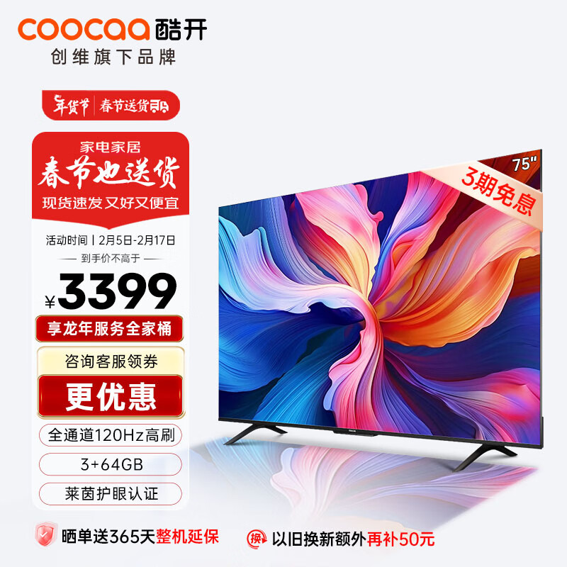 酷开创维K3 Pro 75英寸电视 120Hz高刷 3+64G 4K护眼 声控投屏液晶平板游戏电视机以旧换新75P3D Max价格:4999.00元!