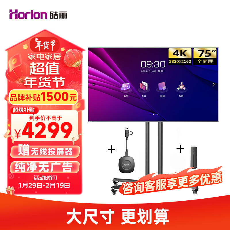 皓丽(Horion)会议平板电视一体机75英寸移动投影电视一体机智慧屏投屏商用显示会议室教学培训大屏75H5桌面底座价格:4299.00元!