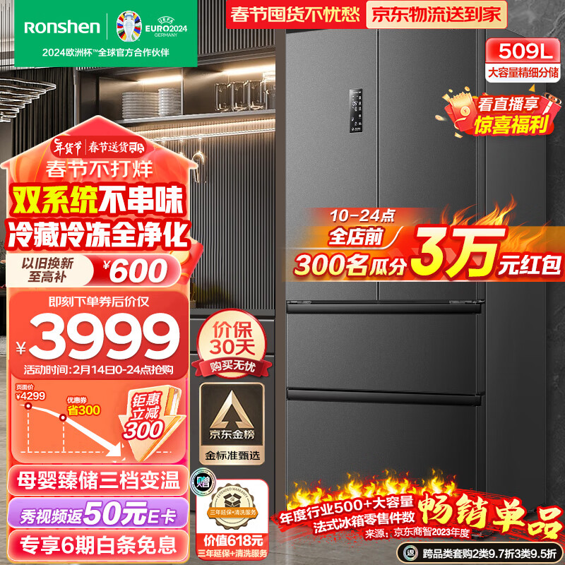 容声(Ronshen)离子净味509升变频一级能效法式多门四开门嵌入式冰箱灰色家用无霜除菌BCD-509WD18MP双循环大容量价格:4299.00元!