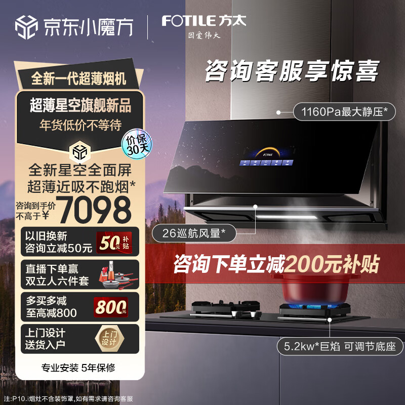 方太抽吸油烟机灶具套装 侧吸式变频烟灶 26大风量 超薄近吸 5.2kW燃气猛火双灶 P10.i+02-TH27B价格:7098.00元!