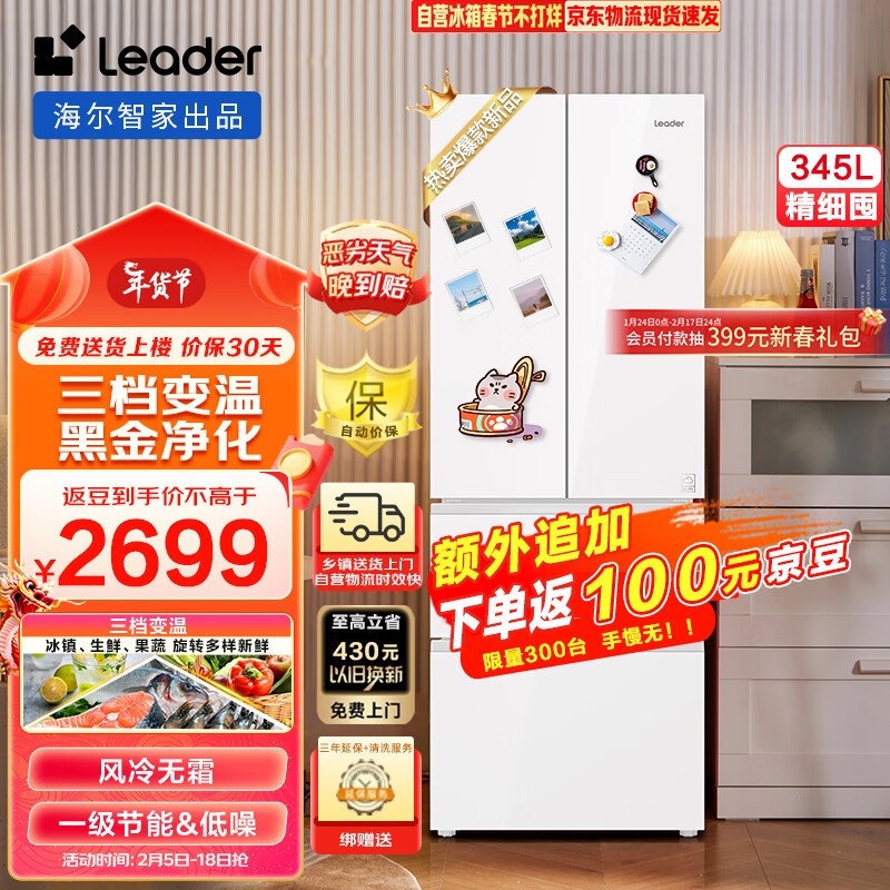 Leader 海尔智家出品345升彩晶风冷无霜净味一级能效变频节能法式四门多门电冰箱BCD-345WLLFDD9CW1U1价格:2799.00元!