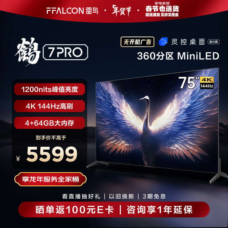 FFALCON雷鸟 鹤7Pro 75英寸MiniLED电视 144Hz高刷 4K超高清 4+64GB 超薄智能液晶游戏平板电视机75R675C价格:5599.00元!
