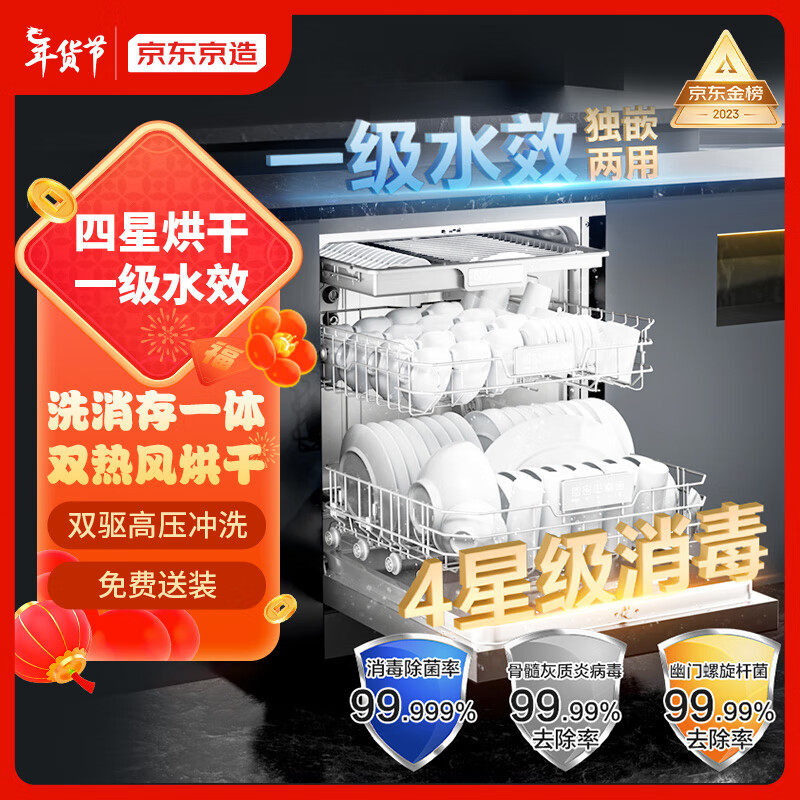 京东京造16套嵌入式大容量洗碗机家用洗消一体 超一级水效四星消毒分层洗热风烘干嵌入式独立式两用价格:2899.00元!