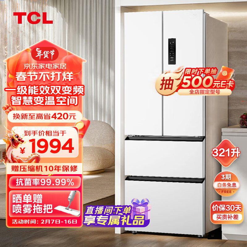 TCL321升法式四门多门白色冰箱一级能效 33分贝低音 风冷无霜 超薄家用电冰箱 R321V5-D象牙白价格:1994.00元!
