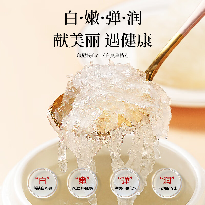 1、这款燕窝没有刷胶,单个燕盏在5克左右,放在水里易泡发,泡发后还是会有燕碎,包装是挺精美的,品质还可以吧,自己吃性价比很高,送人的话这个品质不太好。