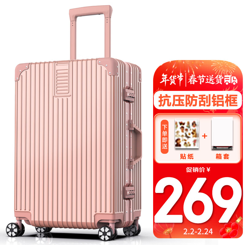 SOO行李箱男铝框商务拉杆箱大容量旅行箱密码箱女皮箱子26英寸玫瑰金价格:269.00元!