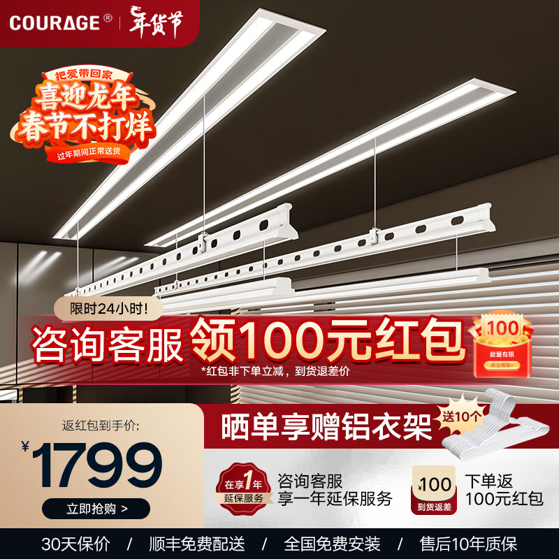 卡瑞琪(COURAGE)电动晾衣架隐形阳台家用隐藏式晾衣架升降晒衣架双杆 2.4米+被杆价格:2899.00元!