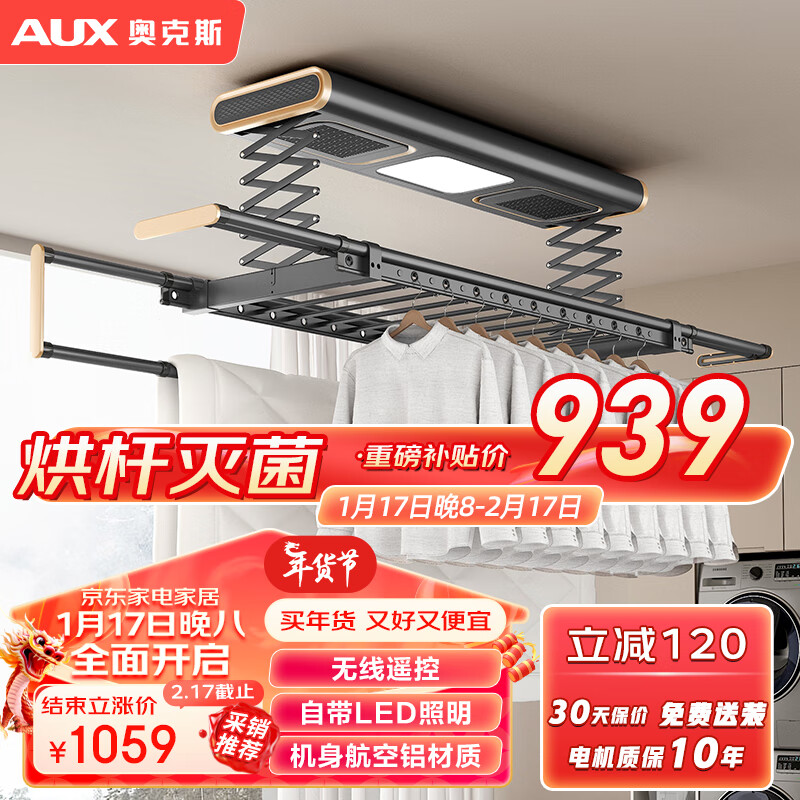 奥克斯(AUX)电动晾衣架智能升级全功能款阳台室外遥控语音照明风干烘干机灰价格:1059.00元!