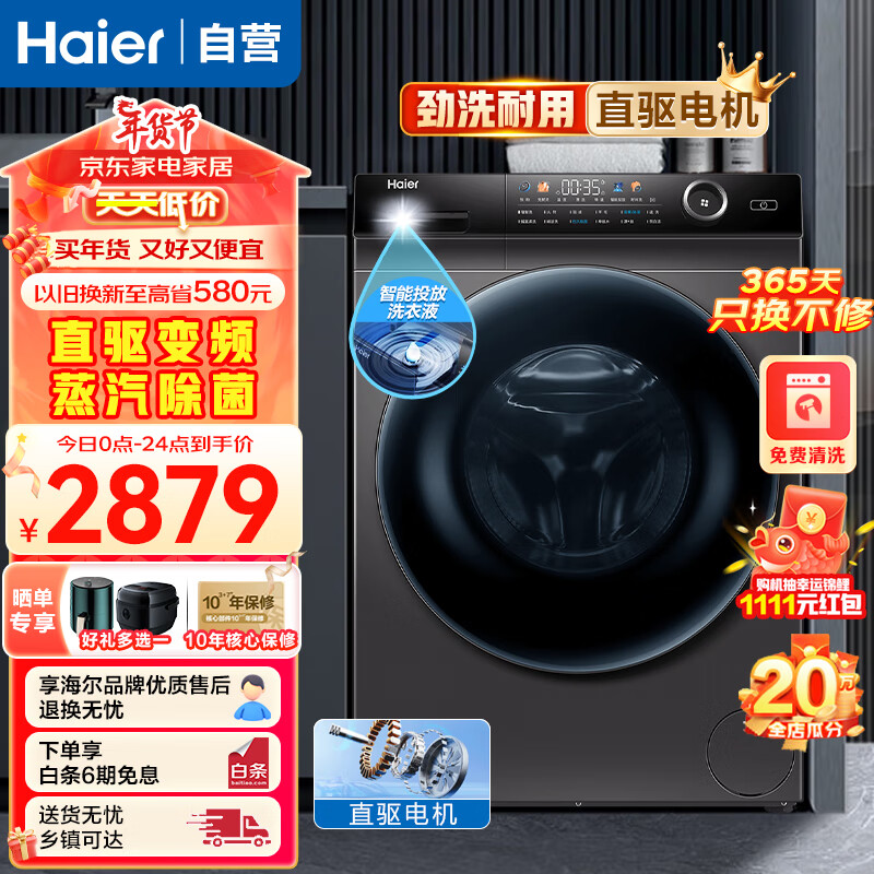 海尔(Haier)10KG洗衣机全自动变频直驱电机智能投放香薰洗巴氏除菌晶彩触屏滚筒洗衣机价格:2899.00元!