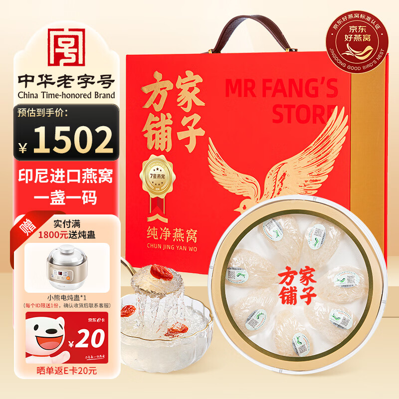 方家铺子 百年老店 坚持利润3% [配炖盅]金标7星干燕窝礼盒干盏50g 印尼可溯源 年货过年送礼孕妇营养品礼品价格:2208.00元!