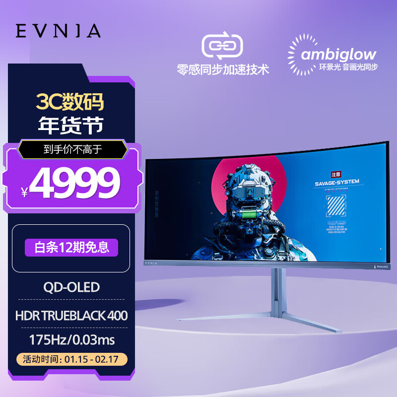 飞利浦 34英寸 QD-OLED曲面带鱼屏 WQHD175Hz0.03ms TypeC 出厂校准HDR400 EVNIA电竞显示器34M2C8600价格:6999.00元!