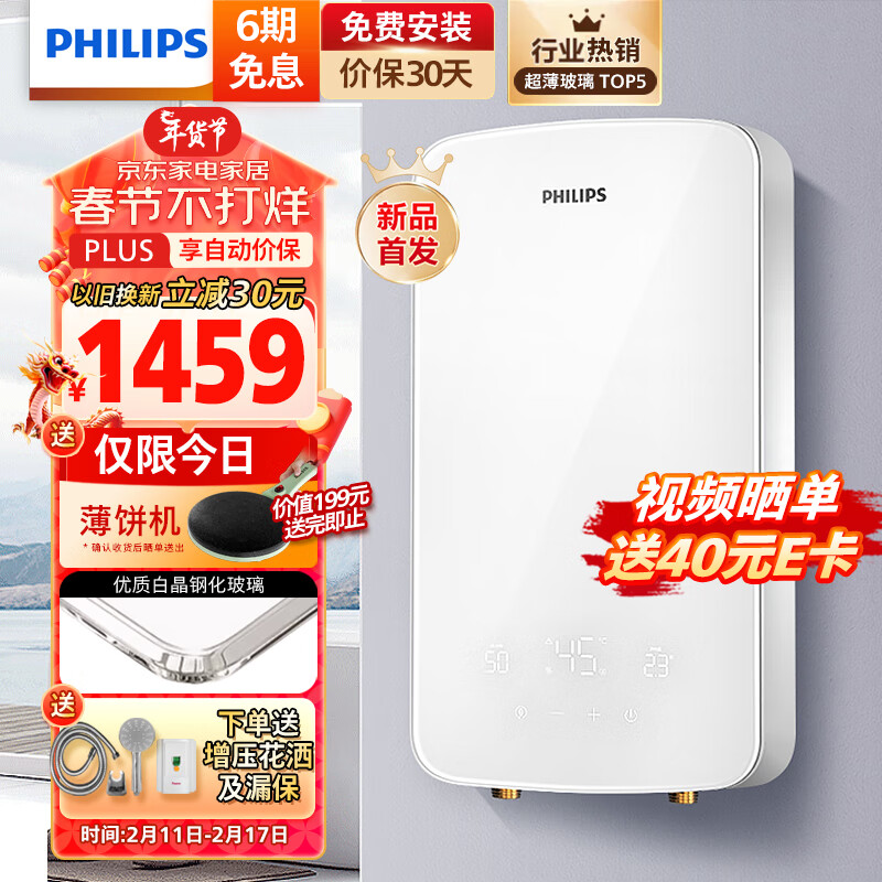飞利浦(PHILIPS)即热式电热水器 液晶数显超白玻璃屏8500W速热无极变频Ai四季恒温免储水 淋浴洗澡AWH1061/93价格:1459.00元!