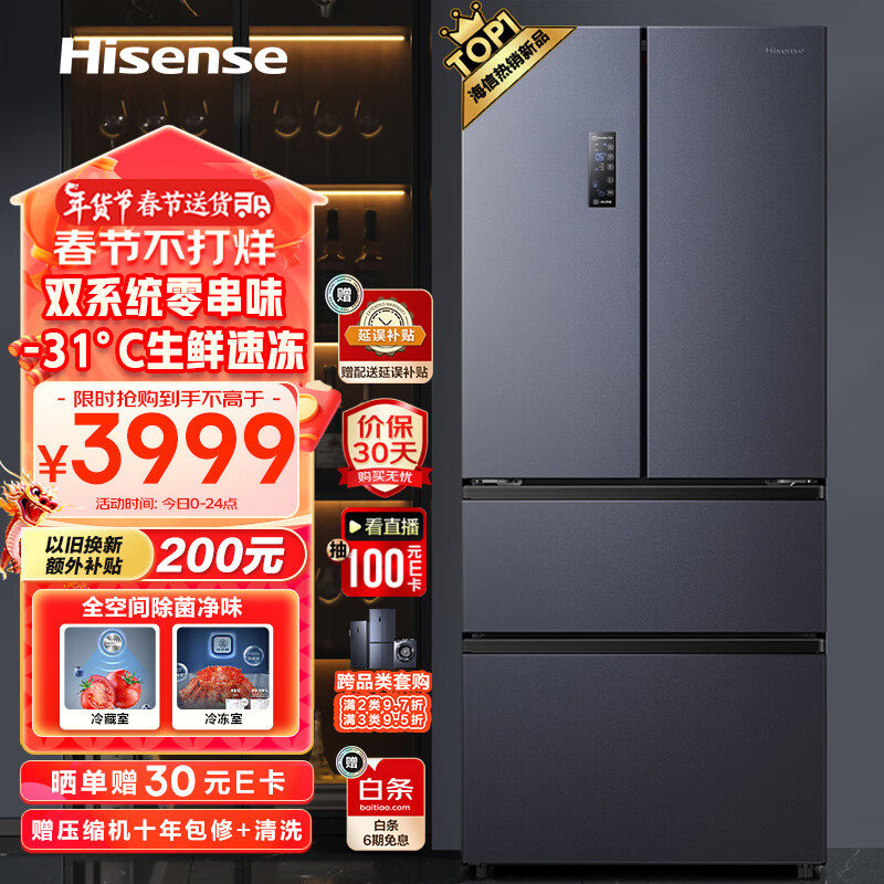 海信(Hisense)法式冰箱四开门家用电冰箱一级能效无霜525L全空间净化双变频BCD-525WNK1PU双系统双循环价格:4499.00元!
