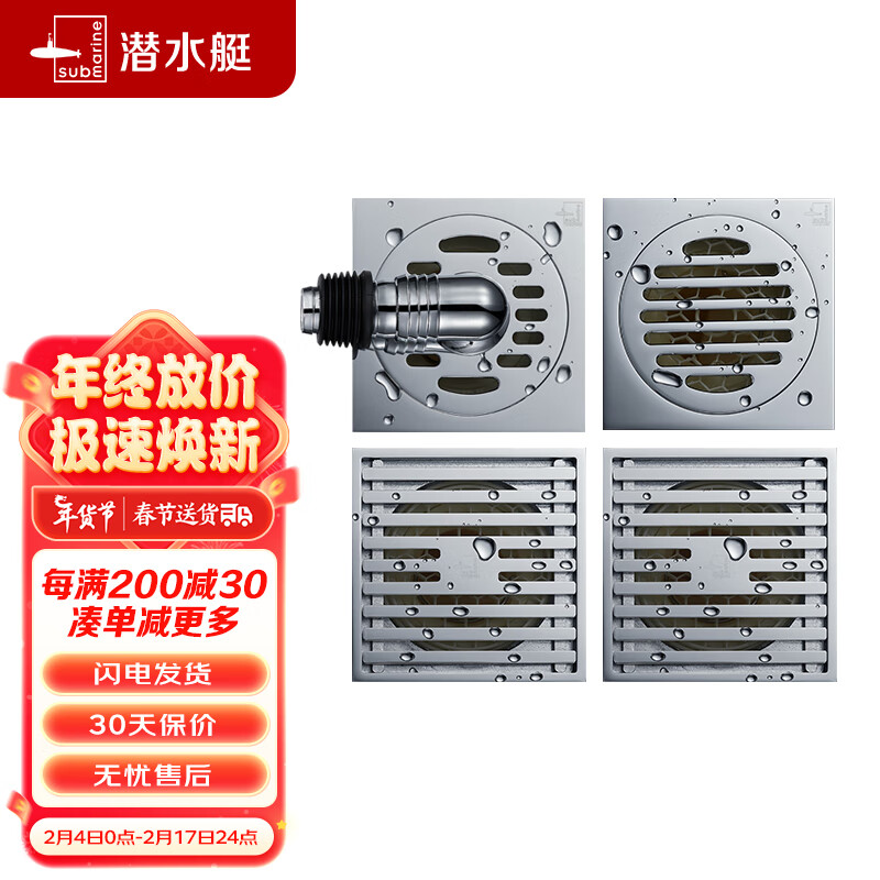 潜水艇(Submarine)黄铜镀铬防臭地漏套装 50管径 2个大排量淋浴+干湿区+洗衣机价格:383.00元!