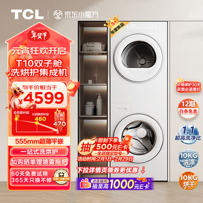 TCL GH200T10-W 双子舱洗烘护集成机一体式洗烘套装 超薄全嵌 10KG全自动滚筒洗衣机+10KG热泵烘干机价格:4599.00元!
