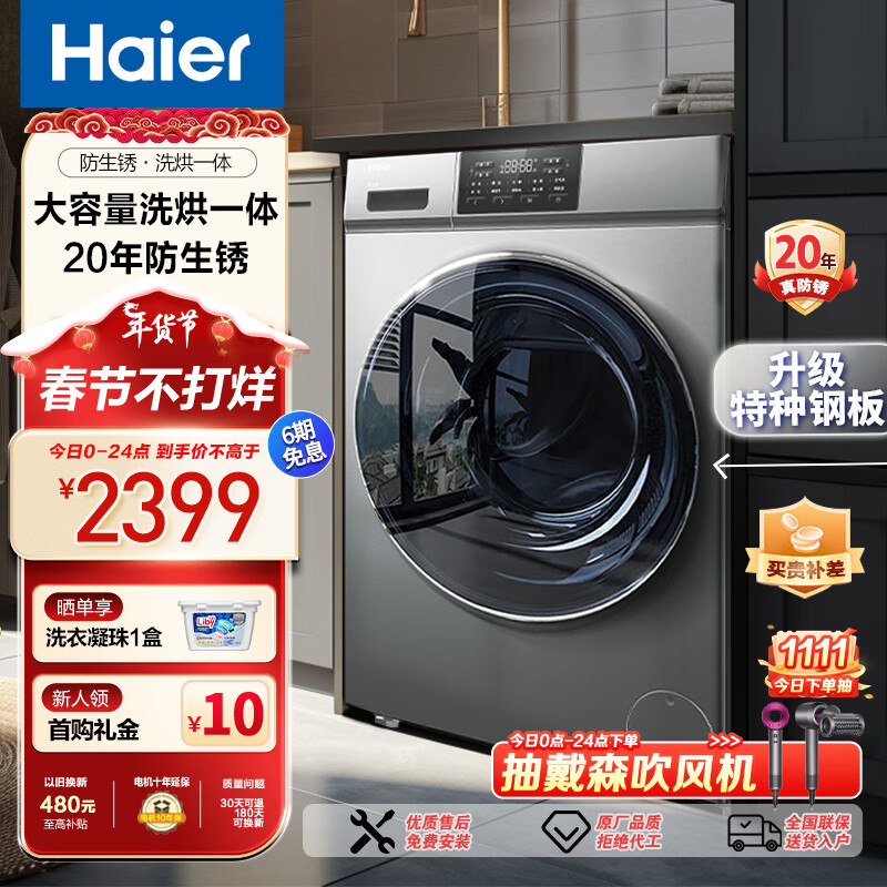 海尔(Haier)洗衣机烘干机10公斤大容量全自动家用滚筒洗烘一体一级能效20年防生锈空气洗羽绒洗 以旧换新HB06价格:2399.00元!