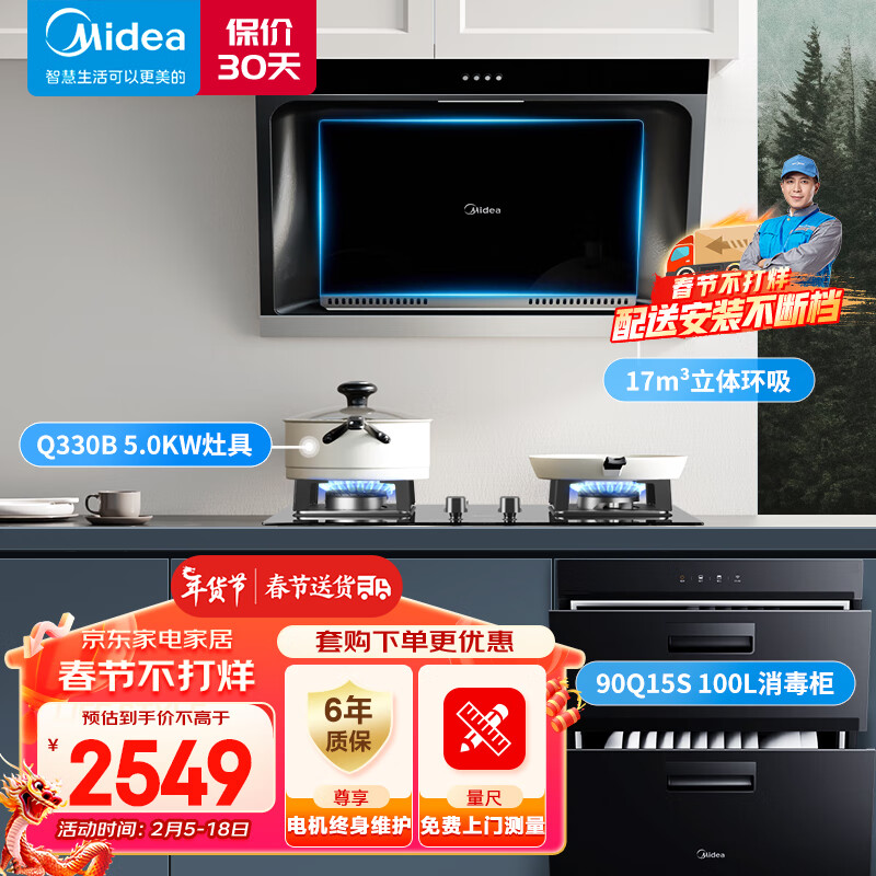 美的(Midea)抽油烟机侧吸17m3大吸力油烟机台嵌两用双灶天然气灶具100L消毒柜厨房三件套J30+Q330+90Q15S价格:2549.00元!