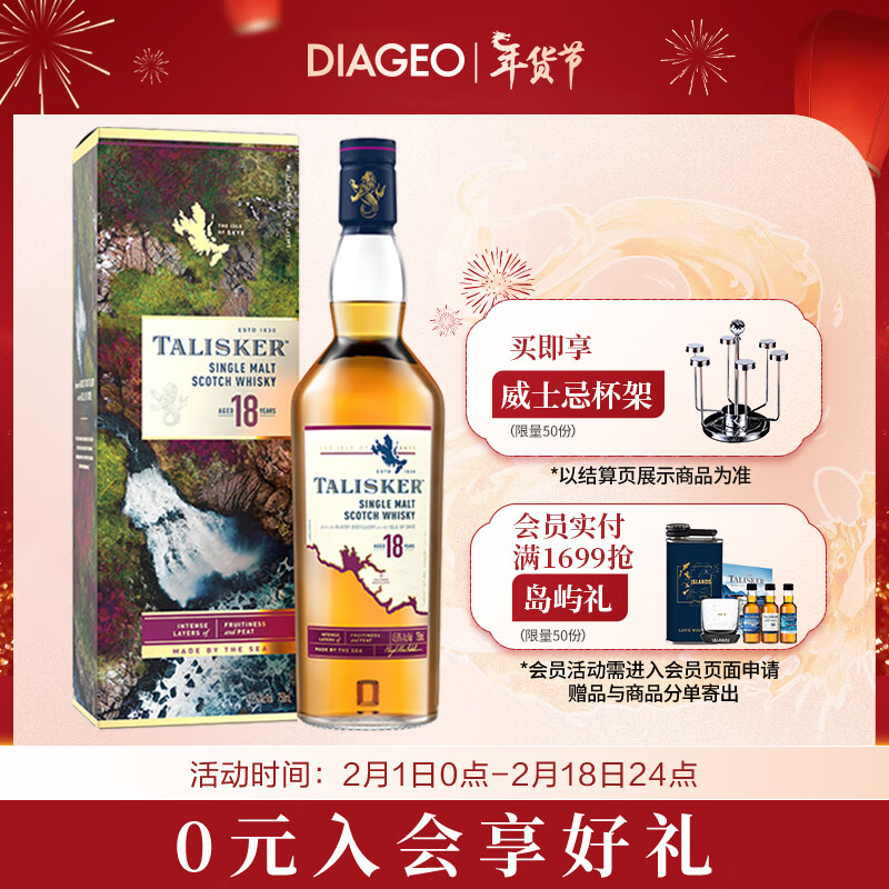 泰斯卡(Talisker)送礼 苏格兰岛屿产区 单一麦芽18年威士忌洋酒 700ml价格:1709.00元!