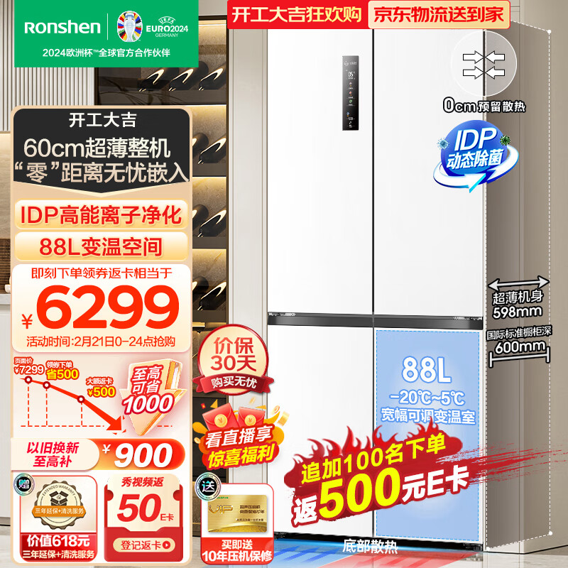 容声(Ronshen)双净·平嵌60cm薄509升十字对开四开门超薄嵌入式冰箱白色家用大容量底部散热BCD-509WD2FPQLA变温价格:7299.00元!