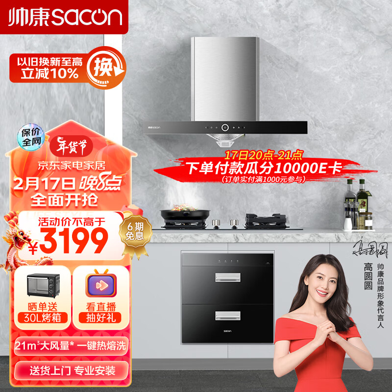 帅康(Sacon)抽油烟机 21大风量家用欧式吸油烟机挥手智控自动清洗T8088+61C+DS1天然气套装价格:3199.00元!