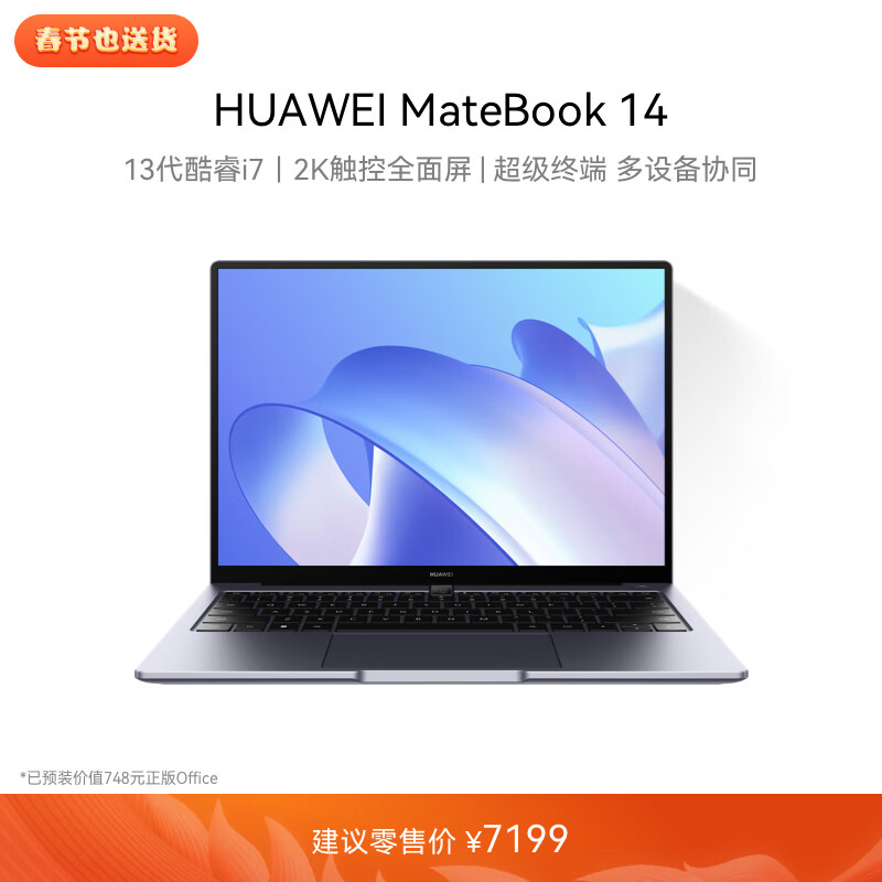 华为MateBook 14笔记本电脑 13代酷睿/2K触控屏/14英寸轻薄办公本/超级终端 i7 32G 1T 深空灰价格:7199.00元!